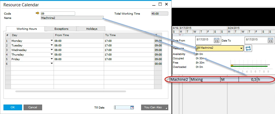 - Occupied: Calculated from all Manufacturing Orders assigned to a specific resource within the selected period.